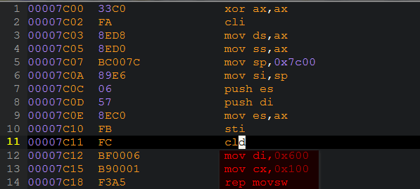将活动分区的第一个扇区(叫做分区启动记录,Volume Boot Record, VBR)读入内存地址0000:7C00处